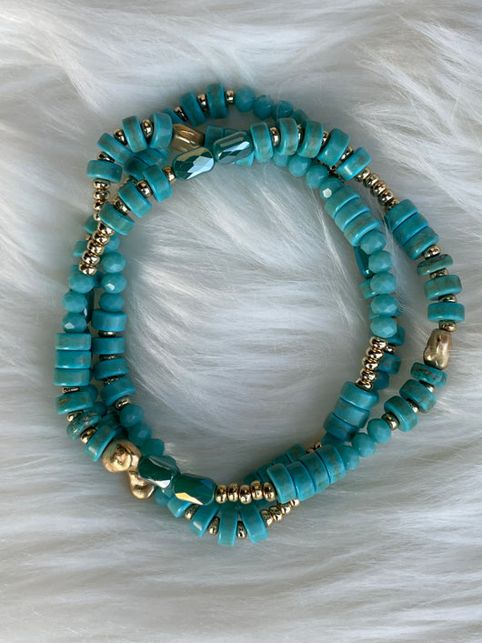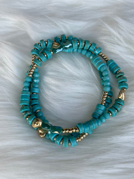 Turquoise & Gold Round Beads Set of 3 Stretch Bracelets