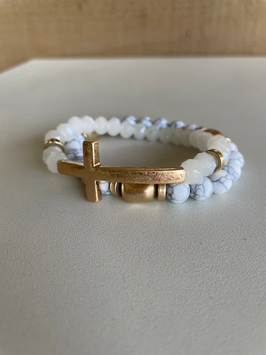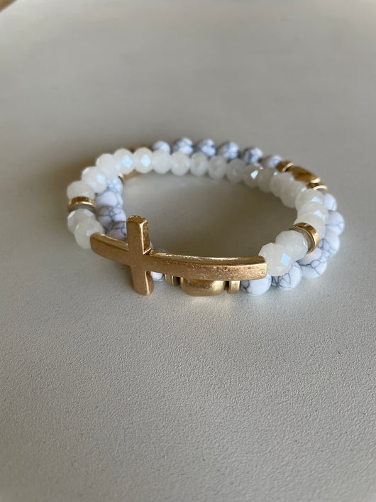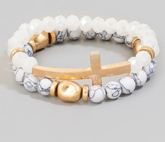White Natural Stone & Gold Beads w/Cross Set of 2 Stretch Bracelets