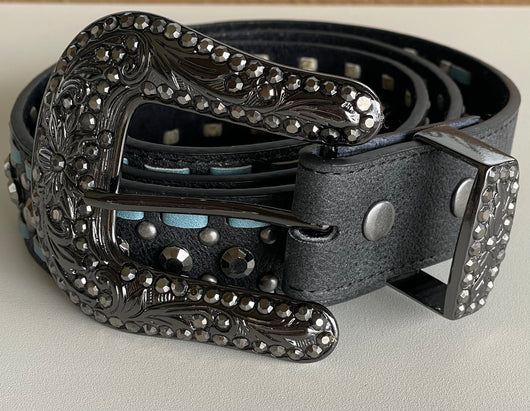 Genuine Leather Black w/Teal & Stones Antique Buckle Belt