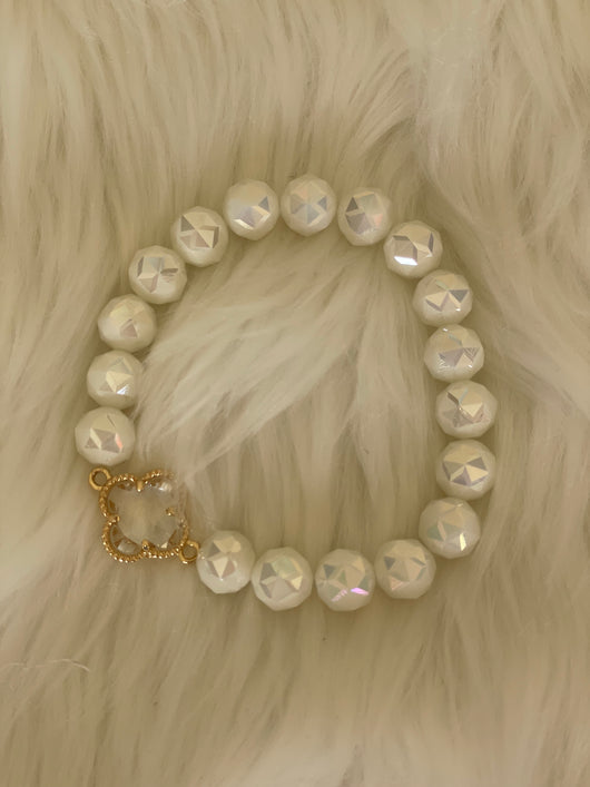 White Glass Beads w/Crystal & Gold Clover Charm Stretch Bracelet