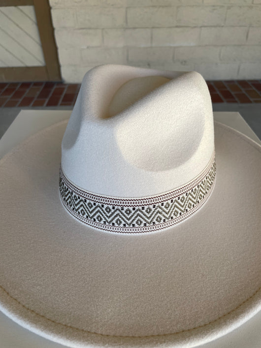 Ivory Flat Brim Fedora Hat w/Olive Green Chevron Band & Adjustable Fit