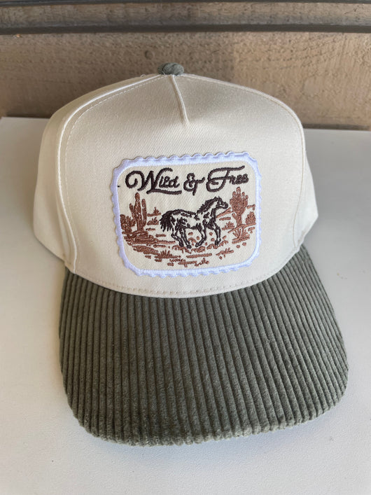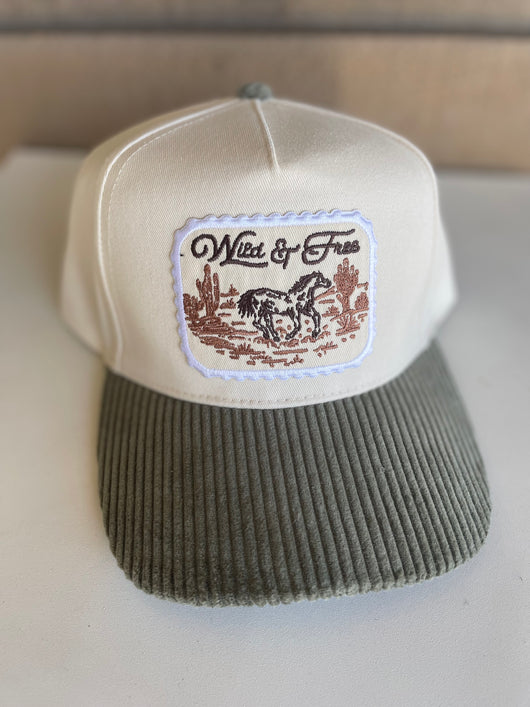 Olive Corduroy Brim and Cream Wild & Free Patch Trucker Hat w/Adjustable Snap Fit