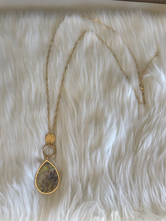 Gold & Abalone Teardrop Pendant Long Chain Necklace