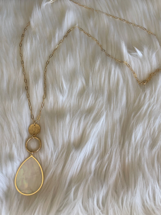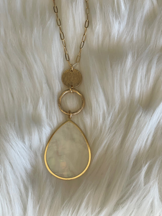 Gold & Mother of Pearl Teardrop Pendant Long Necklace