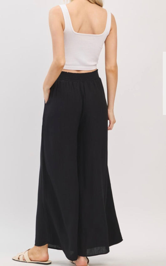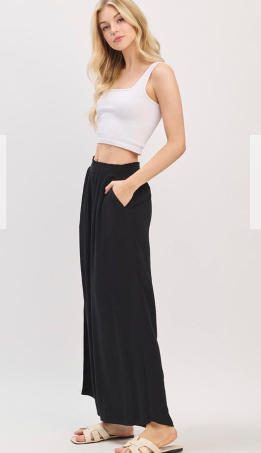 Black Flowy Wide Leg Pants w/Smocked Waist and Pockets