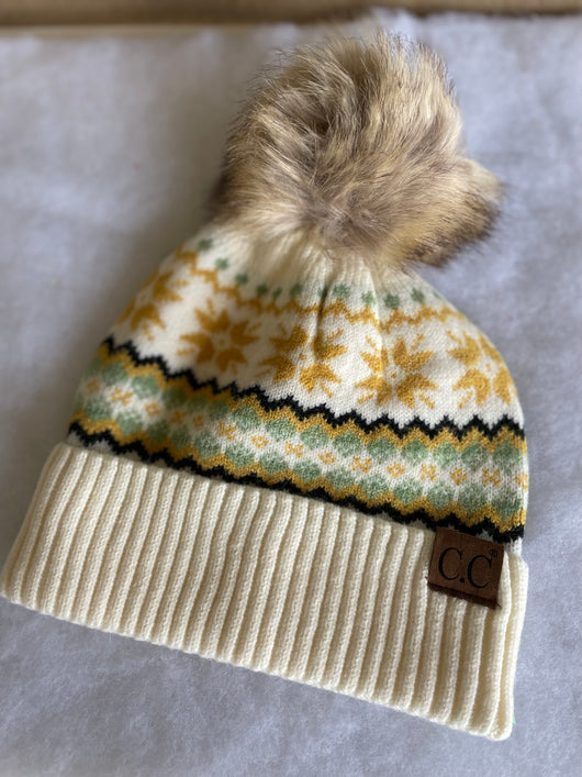 Ivory and Mustard Winter Design Pom Pom & Cuff Beanie by CC Brand