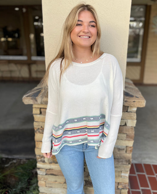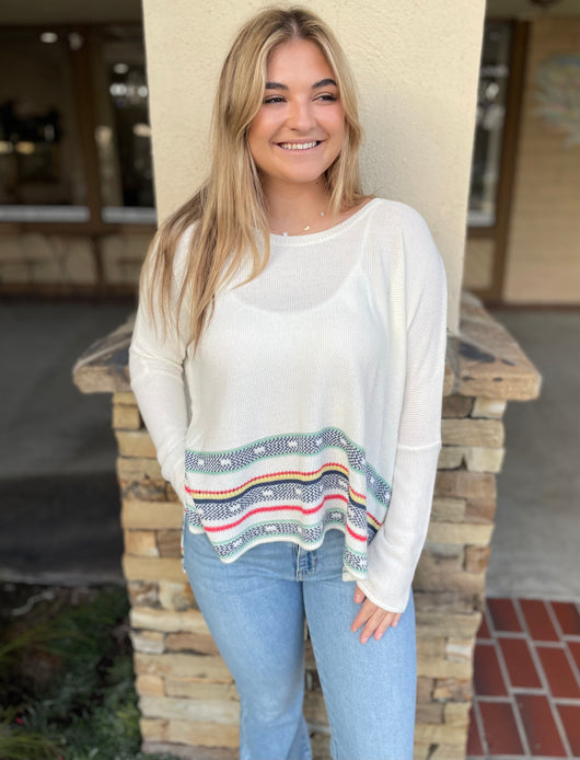 White, Mint & Raspberry Stripe Dolman Sleeve Scoop Neck Sweater Top