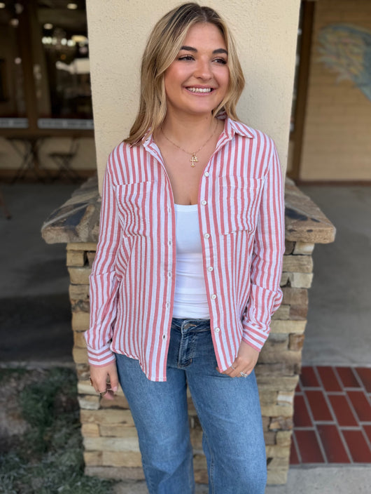Coral & White Stripe Button Down Top w/Front Pockets