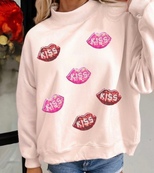 Sequins Kiss Lips Pink Mock Neck Valentines Sweater Top