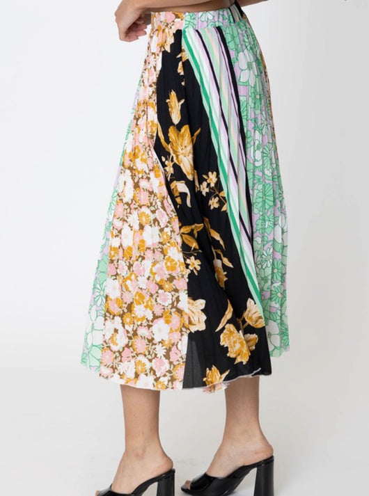 Bali Multi Color and Print Pleated Midi Skirt w/Elastic & Side Zipper