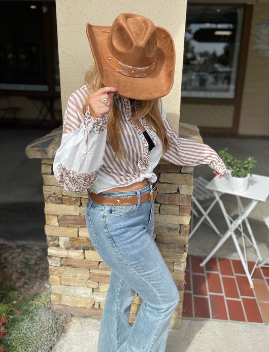 Khaki Leopard & Stripe Patchwork Long Sleeve Button Down Top w/Front Pocket