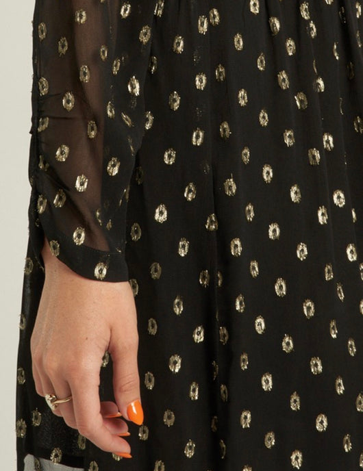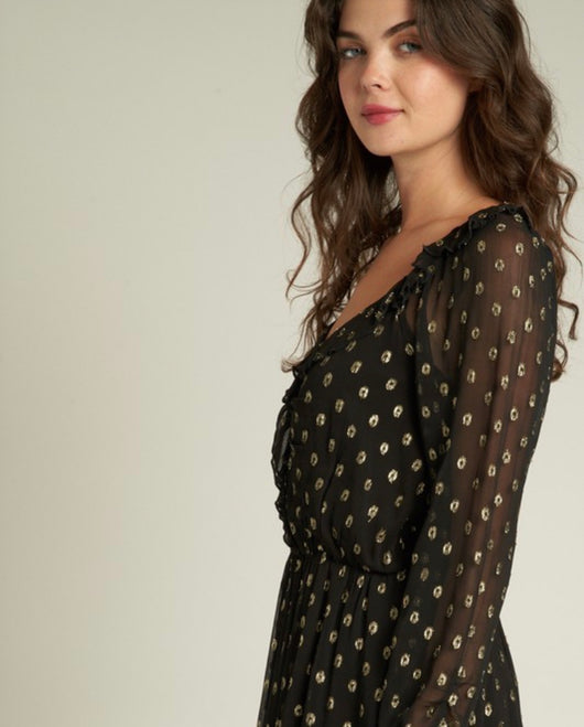 Milan Black Sheer & Gold Luxe Polka Dots Ruffle Detail Mini Dress w/Elastic Waist
