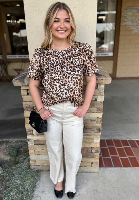 Wild Animal Print Round Neck Bubble Short Sleeve Blouse