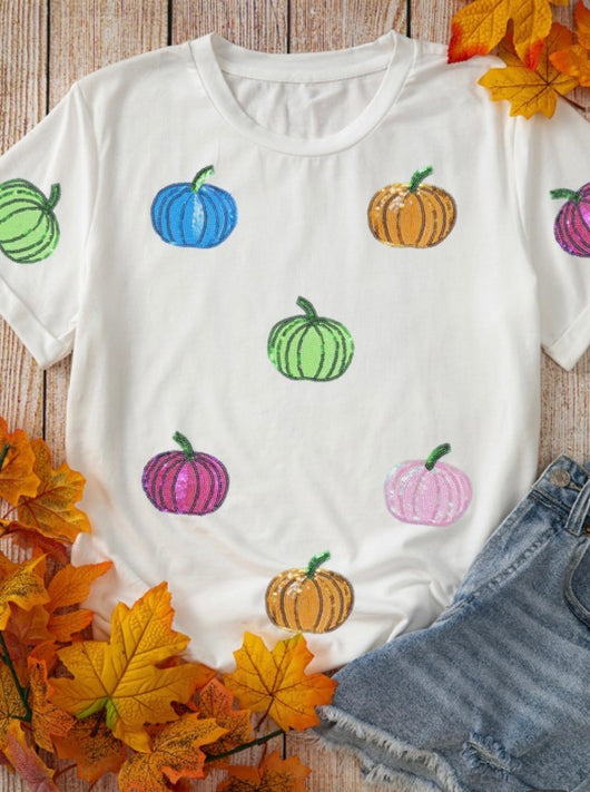 Pumpkin Patch White Cuff Tee w/Sequins Colorful Pumpkins