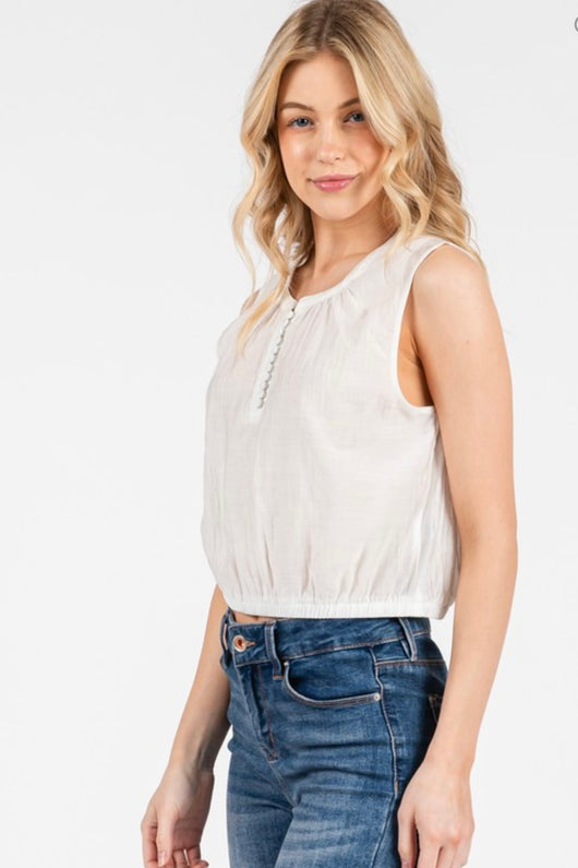 White Sleeveless Half Button Elastic Crop Waist Tank Top